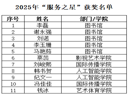 为表彰先进典型、凝聚服务合力,助推学校本科教育教学新一轮审核评估工作,校图书馆开展2025年度 “服务之星” 评选活动。经综合考量服务表现、工作态度及读者反馈,最终从三个校区的图书馆馆员与勤工俭学学生中评选出 11 名 “服务之星”。此次评选也是“书香校园 艺韵飞扬”2025年图书馆读者服务季系列活动之一。